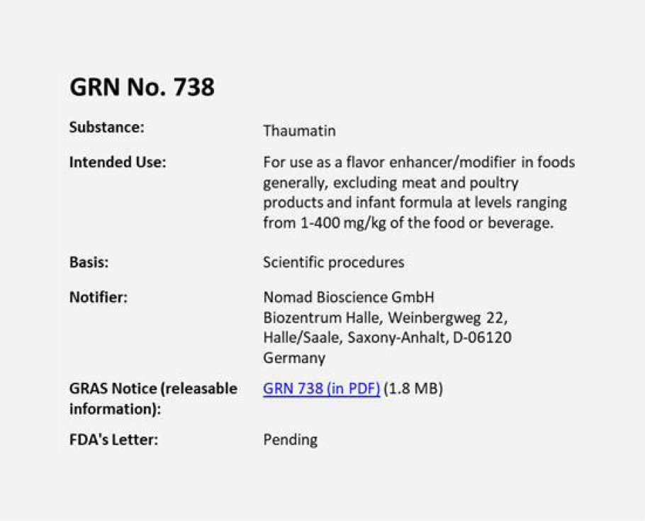 GRAS status for our thaumatin sweetener in: